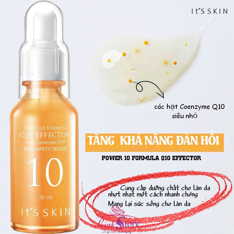 Tinh chất dưỡng da It's Skin Power 10 Formula Q10 Effector với thành phần chiết xuất từ thiên nhiên và Coenzyme Q10 có tác dụng làm sạch da, cân bằng độ pH, cung cấp độ ẩm tức thì, đồng thời cung cấp nhiều dưỡng chất thiết yếu giúp cải thiện làn da khô ráp, tăng khả năng đàn hồi và hoạt hóa tế bào, chống lão hóa và dưỡng trắng da hiệu quả.